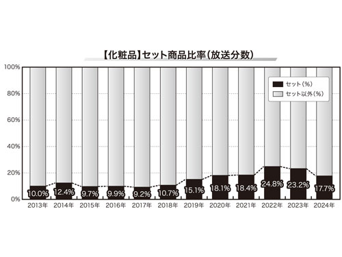 グラフのように、化粧品全体に占めるセット商品の比率は、2013~18年まで、10%前後だった。19年の15・1%から徐々に増え始め、22年には24・8%となっている。セット販売の商品数や、セット販売を行う販社数も確認してみたが、必ずしもセット販売の割合が伸びるのと比例して、商品数や販社数が増えているわけではなかった。