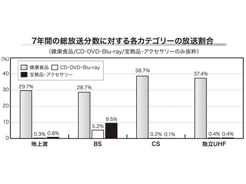 例えば、地上波の場合ならば、健康食品は全体の放送分数の30%前後、コスメは10%前後を毎年維持しているといったことだ。