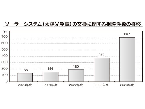 太陽光発電・蓄電池といった住宅設備関連の消費生活相談が急増している。東京都が公表した24年度の相談概要によると、ソーラーシステム(太陽光発電)の交換に関する相談件数は前年比87.4%増と急増。都による補助金制度で、太陽光発電システムに対する関心が高まって企業の信用性に関する相談が増えたほか、ネット検索からの商談、価格が適正なのかといった相談が目立つという。一方で、通販・ECに関する相談も全体の24%を占めており、特に「健康食品」に関する相談が前年比45%増で、定期購入に関する相談が今も増加している。