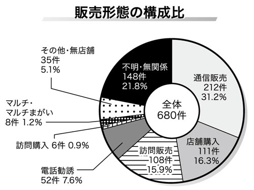 販売形態別で最多の「通信販売」は212件で全体の31.2%を占めた。引き続き定期購入に関する相談が目立つという。一方、「訪問販売」は15.9%、「電話勧誘販売」は7.6%、「マルチ・マルチまがい」は1.2%にとどまり、通販が突出して多かった。