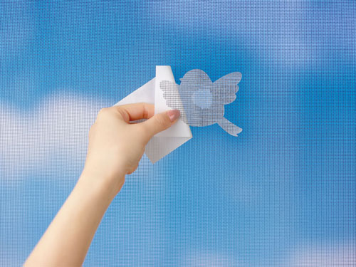 1箱にポーズが異なる3種が3枚ずつ入っている。網戸に貼り付けると、シマエナガが飛んでいたり、網戸のフレームに止まっていたりしているように見える。補修跡が、外を眺めた時の自然のワンシーンになるように設計している。