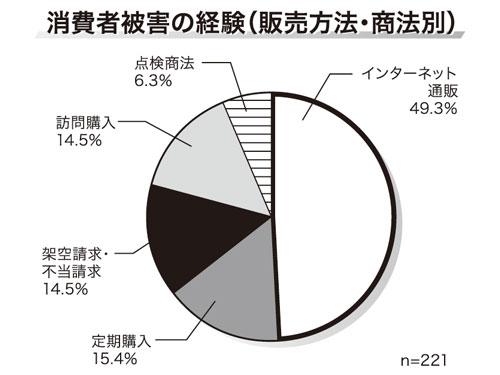 「被害にあったことがある」と回答した人の中では、「インターネット通販」が最も多く49.3%で、他の商法と比べて突出した。2番目に多い「定期購入」の約3倍となった。