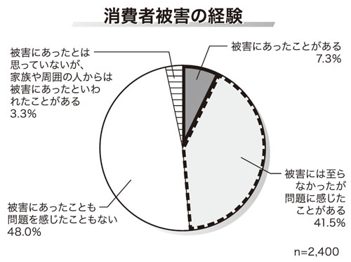 販売方法・商法のいずれか一つでも被害にあったことがあるか聞いたところ、「被害にあったことがある」は7.3%で前回調査と比べ2.9ポイント上昇した。また、「被害には至らなかったが問題を感じたことがある」は41.5%と4割を超えていた。